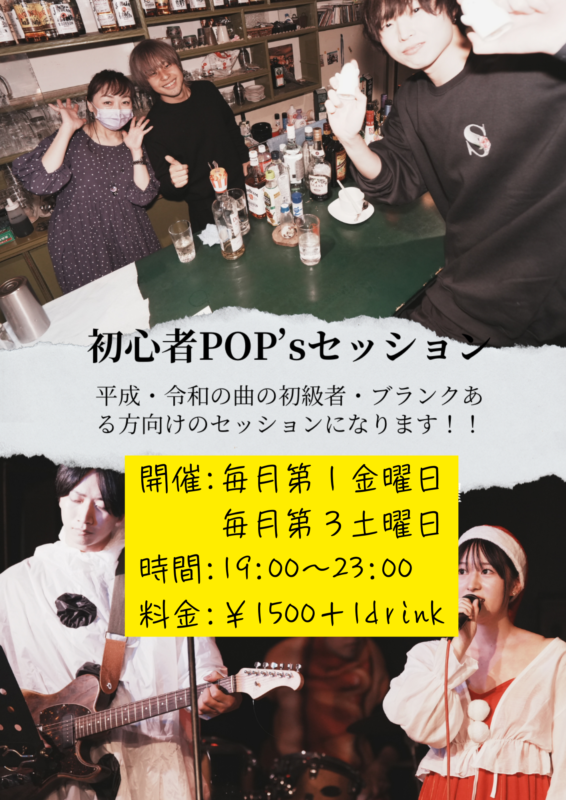 毎月第2木曜日開催1500円+ドリンク代 | 12初心者pop'sセッション初心者pop'sセッションTime: 7:00 PM - 11:00 PM ※来月2026年1月より、第1金曜日、第3土曜日開催になりました!お間違えの無いようによろしくおねがいします!!!!!なんとなく12月27日の決め曲ありセッションのお話とかもできたらいいと思います! 平成から令和の曲を歌本やコード譜面サイト「Uフレット」等を使ってゆるくセッションします♪当店イベントの中では比較的若めの方向けのイベントですがどなたでもお気軽にご参加ください!常時ギターとボーカル人手不足なので是非ご参加お待ちしています! 【やってみよう曲】 丸の内サディスティック 東京事変 君はロックを聴かない あいみょん AM11:00 HY カブトムシ aiko 毎月第2金曜日、第4土曜日開催 1500円+ワンドリンク代 Drショウ Bsユウキ ※当セッションはSNSに写真や動画を掲載するのをOKとしますので、ご承知の上参加ください。 イベント詳細は↓more detailsから! | 13ジャズセッション 服部、渡辺(P) 横尾(B) 中島(Dr)ジャズセッション 服部、渡辺(P) 横尾(B) 中島(Dr)Time: 2:00 PM - 5:00 PM ピアノの女性二人がセッションホストのジャズセッションです。初心者から上級者まで楽しんでセッションしましょう♬ 毎月第2土曜日昼(13:45~)開催 1500円+ドリンク代 OPEN13:45~ セッションスタートは14:00からです ホスト 服部、渡辺(P) 横尾(B) 林(Dr) | 14クラシック&ジャズセッション(こんちゃんJAZZ)クラシック&ジャズセッション(こんちゃんJAZZ)Time: 2:00 PM - 6:00 PM ピアノを演奏するこんちゃんホストのクラシック〜ジャズ、歌物まで、いろいろセッションできるイベントです。やりたい曲がある方、譜面持参ください♪