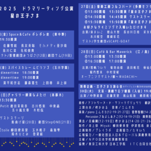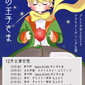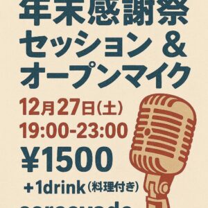 プレイラボ2025 ドラマリーディング公演 星の王子さま【完全予約制】プレイラボ2025 ドラマリーディング公演 星の王子さま【完全予約制】 【完全予約制】①13:00開場 13:30開演「星の王子さま」 ②14:30開場 14:45開演 ゲストステージ ③15:30開場 15:50開演「星の王子さま」 お好きなタイミングで入場いただけます 出演/泉まいこ 増山大智 長谷川日南 采女和樹 山﨑 一真 本川桜空 篠崎彩花 ゲスト/学生劇団əSCAPE-GOAT ※詳細はmoreより確認の上、予約をしてお越しください!! pop'sセッション企画【年末感謝祭セッション&オープンマイク(決め曲あり)】pop'sセッション企画【年末感謝祭セッション&オープンマイク(決め曲あり)】Time: 7:00 PM - 11:00 PM 毎月第2金曜日、第4土曜日開催の初心者pop'sセッション×コルコバード企画の感謝祭セッション(決め曲あり)になります!!!普段音楽で絡んでいただけている皆様に、感謝の気持ちを込めて、持ち出しでパーティー料理をご用意した、決め曲ありのセッションイベントを開催致します!!普段このセッションに参加していない方も是非お気軽に参加して頂けたらと思います!!日程が近いため、演奏できない曲が多々ある可能性がありますご容赦下さい!余った時間は通常セッションになります!! 曲の提案については、運営(ショウ、ユウキ)とご相談ください!(lineID:sho3153) 曲にこだわりのない方は参加とだけ伝えていただければ、こちらからの提案させて頂きます!! 1500円+ワンドリンク代(軽い料理付き) ※当セッションはSNSに写真や動画を掲載するのをOKとしますので、ご承知の上参加ください。 【演奏曲予定と空いているパート※閲覧のみ、編集不可】 通常のイベント詳細は↓more detailsから! | 28JPOPセッションJPOPセッションTime: 2:30 PM - 6:30 PM 別名【生バンドカラオケ!】人気イベント【JPOPセッション】です!カラオケ好きな方は是非このイベントに遊びに来てください!もちろん楽器の演奏も歓迎です!やりたい曲がある方は人数分の譜面持参ください!こちらでも多くの曲の譜面があります!