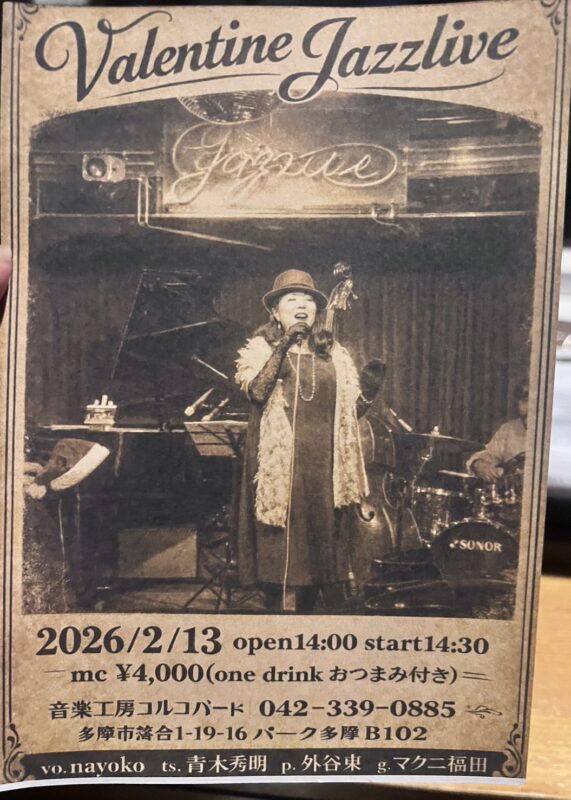 毎月第2木曜日開催1500円+ドリンク代 | 13vo.nayokoさん企画【Valentine JazzLive】vo.nayokoさん企画【Valentine JazzLive】 open 14:00~start 14:30~ ¥4000(1drink おつまみ付き) vo.nayoko ts.青木秀明 p.外谷東 g.マクニ福田 N様 貸し切りN様 貸し切りTime: 12:00 PM - 5:30 PM 貸し切りイベントになります