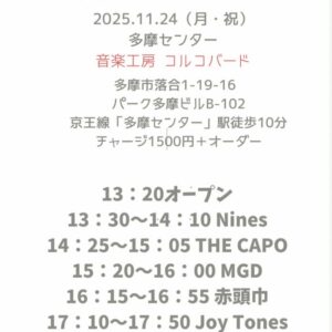 [タイムスケジュール] 13:20オープン 13:30~14:10 Nines 14:25~15:05 THE CAPO 15:20~16:00 MGD 16:15~16:55 赤頭巾 17:10~17:50 Joy Tones 2025.11.24(月・祝) チャージ ¥1500+1DRINK モダンジャズセッションモダンジャズセッションTime: 7:00 PM - 11:00 PM  黒本(ジャズ・スタンダード・バイブル)を中心に演奏します。他にやりたい曲がある場合は、3部、4部程の楽譜をお持ちください! 楽しくセッションしましょう♪ 第2、4、5月曜日開催 ホスト 達川G 横尾B マスターDr ¥1500+1drink | 25pops&soul&all genreセッションpops&soul&all genreセッションTime: 7:00 PM - 11:00 PM  凄腕ギタリスト福田マクニさんと素敵な歌声ボーカリストkunieさんホストのオールジャンルセッションです! やりたい曲がある場合は3.4部ほど譜面をお持ちください! 用意してある譜面もたくさんあります!お好きな楽器かボーカルでご参加ください♪ ¥2000+1drink ホスト Gt.マック福田 Vo.Kunie | 26超初心者ジャズセッション超初心者ジャズセッションTime: 7:00 PM - 11:00 PM  初心者向けのやさしいジャズセッションです。黒本(ジャズ・スタンダード・バイブル)などからいるメンバーで遊べる曲をやっていきます。 店イベントで一番緩いセッションになります。 店の人間3人体制のため、お店初めての方やセッション初めての方はジャンルに限らず、ご都合合えば1回この日に来ることをお勧めしています。 毎月第2第4水曜日開催 世話人 マスター&ショウ&コウ ¥1500+1drink ↓参考曲と初心者向けのルールはmoreから | 27グルーヴナイトグルーヴナイトTime: 7:00 PM - 11:00 PM  ブラックミュージックベースのノンジャンルセッション [Groove Night] です。傾向はJust a Two of Us、Feel Like Makin' Love、Play that Funky Music、丸サ、接吻などが定番です。 リスナーさんも大歓迎! ソフドリ・お酒・フード各種アリ〼 歌いたい・演奏したい曲は、お手持ちの譜面のコピーを3~4部ご持参ください。 譜面がなければ、事前にリクエストいただければ用意できますので、ホスト斎藤さんにご連絡ください。 毎月第4木曜日開催 ホスト gt.齋藤勇朗 ba.秋山瑞穂 dr.瀧本未有 ¥2000+1drink 詳細は↓more(Facebookページ)をご確認ください。 | 28貸し切り貸し切り  11:00~リハーサル 13:00~17:00 貸し切りパーティ NEXT LEVEL ユーミンセッション♬ユーミンセッション♬Time: 7:00 PM - 11:00 PM  ユーミンの曲のセッションです♪ 歌う人、演奏する人いらっしゃ~い!! ・中央フリーウェイ ・卒業写真 ・12月の雨 ・ルージュの伝言 ・生まれた街で ・瞳を閉じて ・さみしさのゆくえ ・きっと言える ・緑の町に舞い降りて ・やさしさに包まれたなら などなど、たくさんの曲が演奏可能です♪ 世話人、マスター、若さん(gt)、タコ(bs)、なおこさん(Pf) 毎月第四金曜日開催 ¥1500+1drink ↓現在のレパートリーです | 29初心者pop'sセッション初心者pop'sセッションTime: 7:00 PM - 11:00 PM  ※今月は第四土曜日→第五土曜日開催になります お間違いないようによろしくおねがいしますm(__)m 平成から令和の曲を歌本やコード譜面サイト「Uフレット」等を使ってゆるくセッションします♪当店イベントの中では比較的若めの方向けのイベントですがどなたでもお気軽にご参加ください!常時ギターとボーカル人手不足なので是非ご参加お待ちしています! 【やってみよう曲】 空も飛べるはず スピッツ 君はロックを聴かない あいみょん Hello, Again 〜昔からある場所〜 My Little Lover 毎月第2金曜日、第4土曜日開催 1500円+ワンドリンク代 Drショウ Bsユウキ ※当セッションはSNSに写真や動画を掲載するのをOKとしますので、ご承知の上参加ください。 イベント詳細は↓more detailsから! | 30R様リハーサル 貸し切りR様リハーサル 貸し切りTime: 5:00 PM - 9:00 PM  貸し切りになります。 | |||