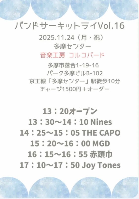 | 24バンドサーキットライブVOL.16バンドサーキットライブVOL.16Time: 1:20 PM - 6:30 PM  井上さん主催のブッキングライブです!